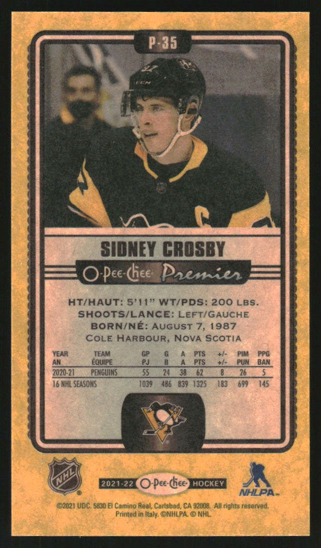 2021-2022 - Sidney Crosby - O-Pee-Chee OPC Premier Tallboys Yellow - #P35