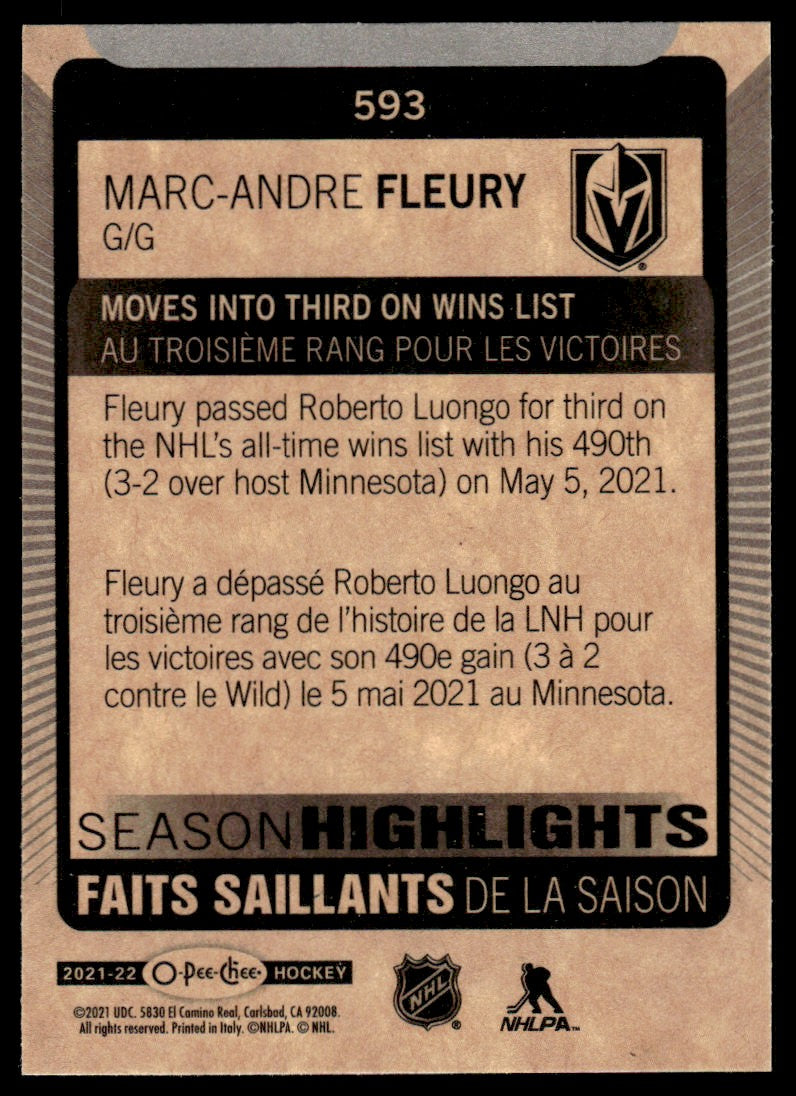 2021-2022 - Marc-Andre Fleury - O-Pee-Chee - #593